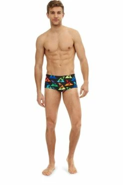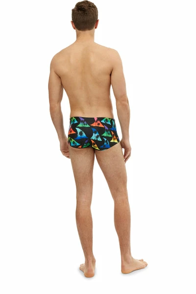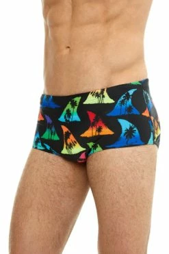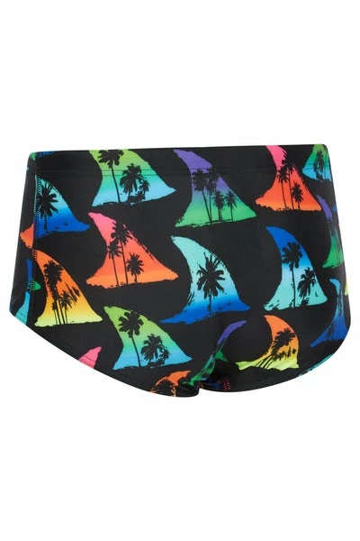 Made from 100% polyester, these jammers are durable, chlorine resistant, and quick-drying. They feature a black base, colourful fin design, and palm tree silhouettes for extra contrast. The coloured fins give tropical sunset and ocean water vibes, don’t you think? All in all, we think they’ve got a real bite to them!